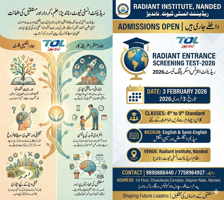 ناندیڑ کے معروف تعلیمی ادارے ریڈیئنٹ انسٹی ٹیوٹ کی جانب سے تعلیمی سال 2026 کے…