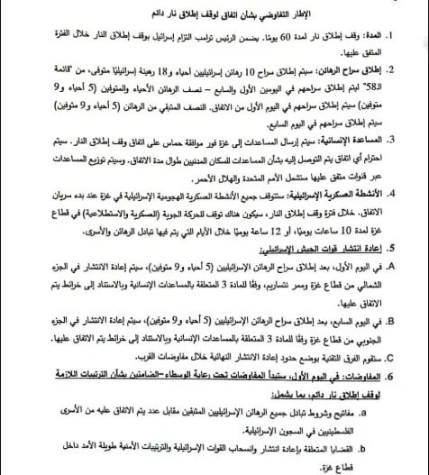حماس نے امریکی ضمانتوں کی بھی تصدیق کی ہے کہ مذاکرات 60 دن میں ایک مستقل جنگ بندی کے قیام تک جاری رہیں گے۔اس کے علاوہ، حماس نے کہا ہے کہ معاہدہ اسرائیلی فورسز کے انخلا پر بھی مشتمل ہے جو متفقہ لائنوں تک ہو گا۔