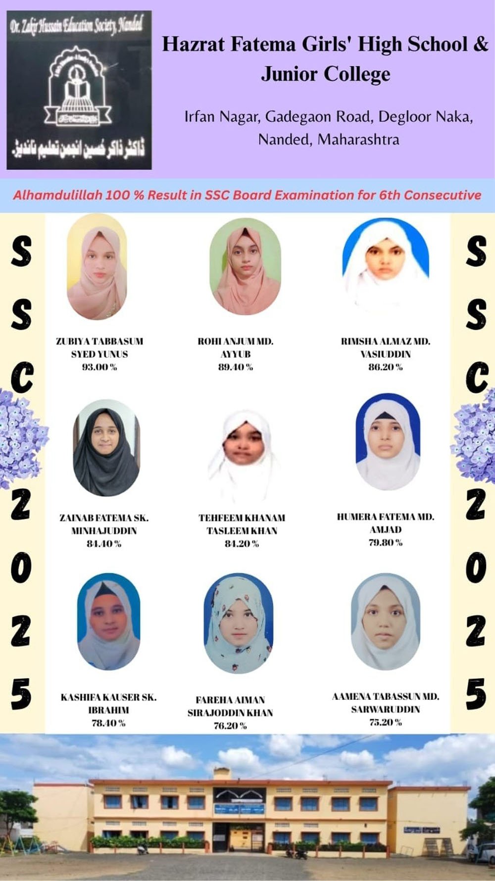ناندیڑ:13؍مئی:ڈاکٹر ذاکر حسین انجمن تعلیم ناندیڑ کے زیرانتظام حضرت فاطمہ گرلز اُردوہائی اسکول وجونیئر کالج کا100%شاندار نتیجہ رہا۔ تمام طالبات نے نمایاں کامیابی حاصل کرکے ادارے اور اسکول کانام روشن کیا۔ جس میں 09طالبات نےDistinction میں اور 14طالبات نے فرسٹ کلاس ، اسی طرح 12؍ طالبات نے سیکنڈ کلاس سے کامیابی حاصل کی۔