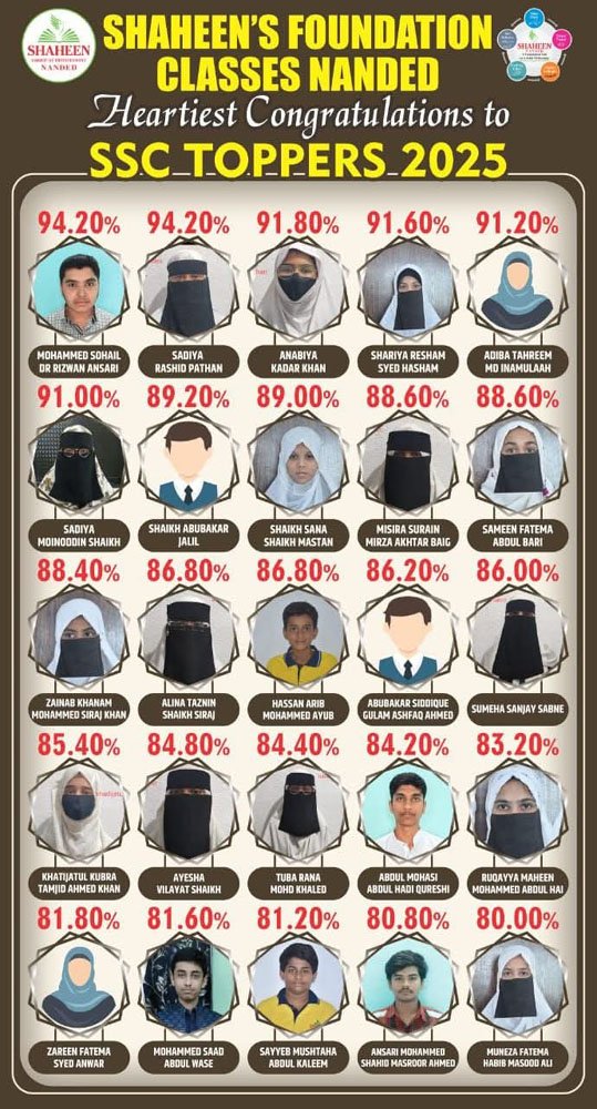 ناندیڑ – شاہین فاؤنڈیشن کلاسز، ناندیڑ کی جانب سے SSC امتحانات 2025 میں شاندار کامیابی حاصل کرنے والے تمام ہونہار طلبہ و طالبات کو دل کی گہرائیوں سے مبارکباد پیش کی گئی ہے۔ ادارے کے ڈائریکٹر عبدالحئی سر نے کامیاب طلبہ، ان کے والدین و سرپرستوں اور اساتذہ کو اس نمایاں کامیابی پر مبارکباد دیتے ہوئے کہا کہ: