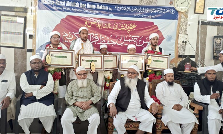 اردھاپور (شیخ زبیر) مدرسہ حضرت عبداللہ ابن امِّ مکتومؓ اردھاپور کا عظیم الشان سالانہ اجلاس و مجلس تکمیل حفظ قران کریم ودستاربندی بڑے ہی تزک و احتشام کے ساتھ مدرسہ ہذا میں صبح 10 بجے منعقد ہوا اجلاس کی صدارت علاقہ مرہٹواڑہ کے بزرگ عالمِ دین حضرت مولانا عبدالوہاب صاحب بیتی بانی ومہتمم مدرسہ ہذا نے فرمائی جبکہ مہمانِ خصوصی کی حیثیت سےشہر ناندیڑ کے نوجوان عالم دین حضرت مولانا محمد سعد عبداللہ صاحب ندوی نے شرکت کی، قران کریم کی تلاوت اور نعتیہ