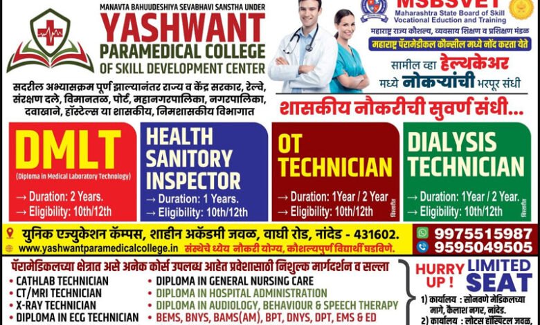 ناندیڑ: شہر کے معیاری اور معتبر تعلیمی اداروں میں شمار ہونے والے **یشونت پیرا میڈیکل کالج میں DMLT (ڈپلومہ اِن میڈیکل لیبارٹری ٹیکنالوجی) کورس کے لیے داخلے باضابطہ طور پر شروع ہو چکے ہیں، جبکہ **13 دسمبر** آخری تاریخ کے طور پر مقرر کی گئی ہے۔ میڈیکل سیکٹر میں بڑھتی ہوئی ضرورتوں کے پیشِ نظر طلبہ کی جانب سے داخلوں میں نمایاں اضافہ دیکھا جا رہا ہے۔