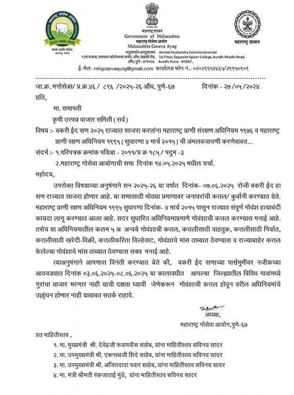 گوسےوا آیوگ کا غیر قانونی سرکولر… قربانی عید کے لیے جانوروں کے بازار باقاعدہ لگانے کا مطالبہ: ونچت بہوجن اگھاڑ ی کا موقف